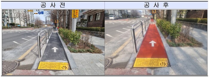 구는 이번 공사를 통해 해당 구간의 자전거도로 유형을 ‘서울시 자전거 이용 시설 설치 및 관리지침(2021)’상 자전거도로 설치 검토 우선순위 권고에 따라 기존 ‘차도높이형’에서 ‘보도높이형’으로 개선했다.