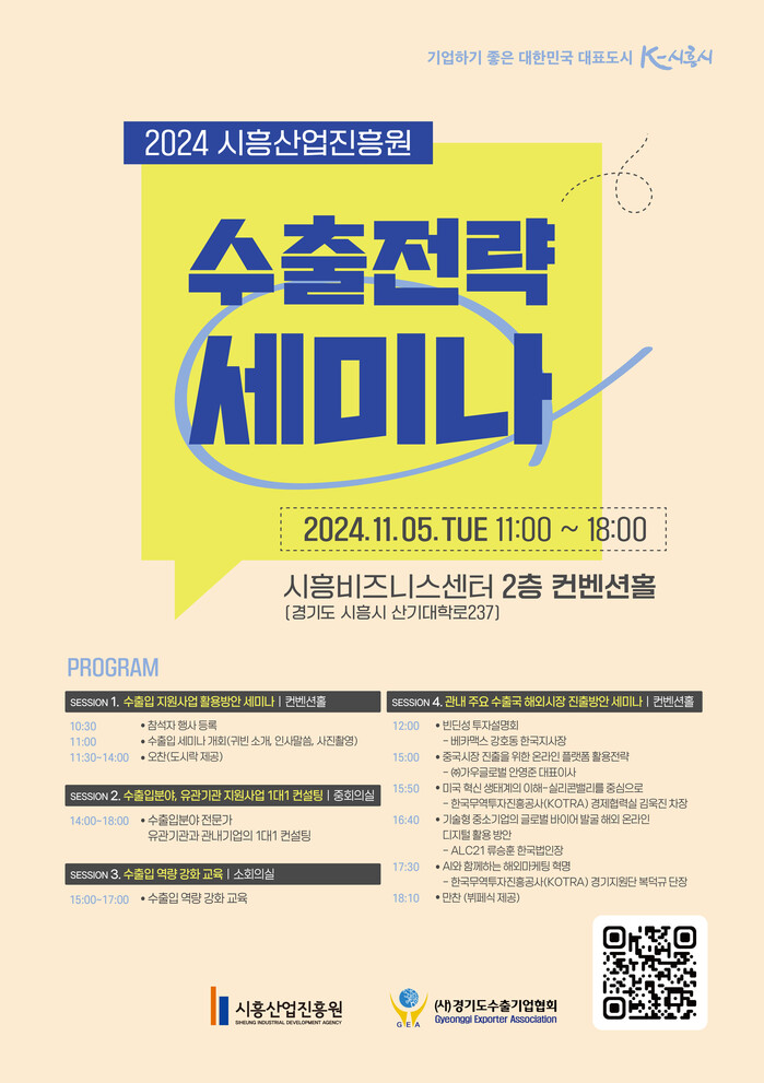 한편, 11월 5일까지 사전등록 사이트를 통해 참여 등록, 1대1 컨설팅 신청, 세미나 질의응답 등을 신청할 수 있다. 자세한 사항은 시흥산업진흥원 수출입지원실로 문의하면 된다.