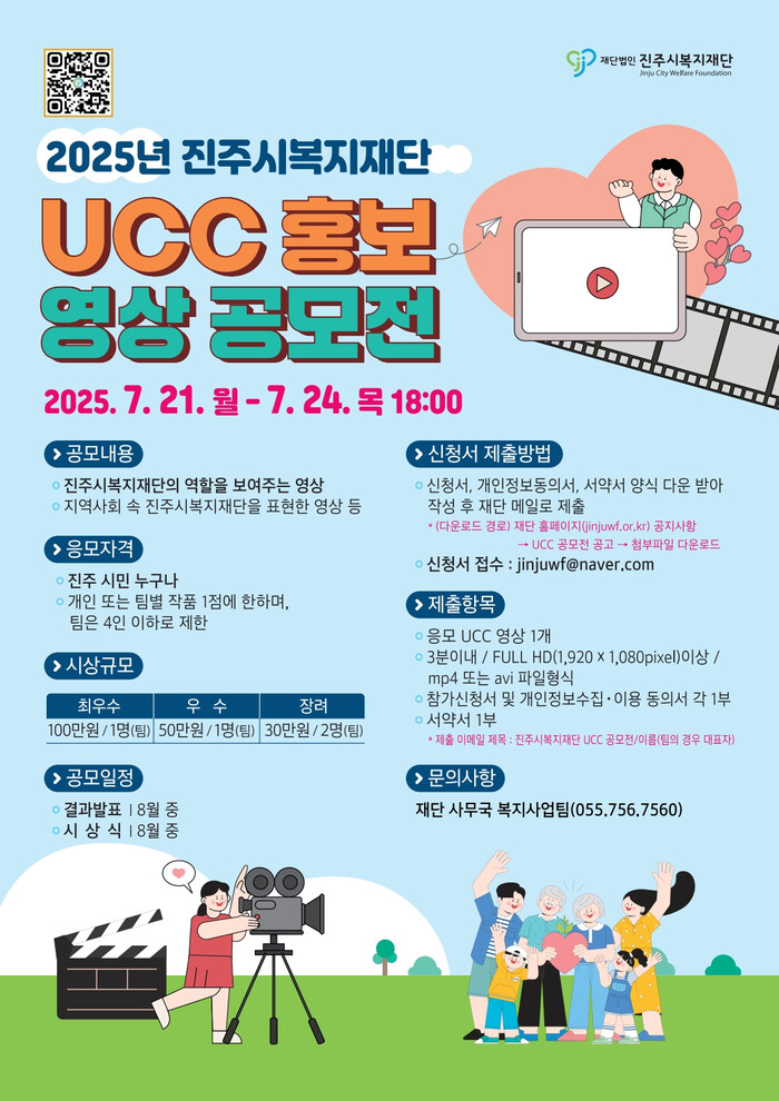 접수 기간은 오는 7월 21일부터 24일까지이며 최우수상 1편, 우수상 1편, 장려상 2편을 선정하여 시상하고, 선정된 UCC 영상은 향후 진주시복지재단의 공식 홍보 영상으로 활용될 예정이다.