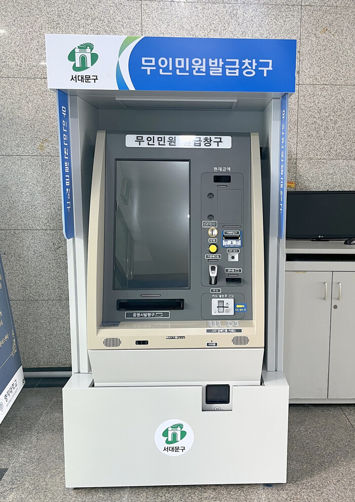 [시민일보 = 홍덕표 기자] 서울 서대문구(구청장 이성헌)가 주민 편의를 위해 최근 남가좌2동 명지대학교(거북골로 34) 행정동 건물 1층에 민원서류 발급이 가능한 무인민원발급기를 설치했다.