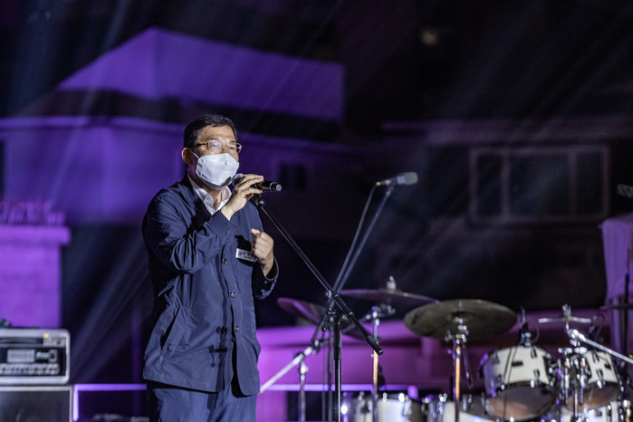 서울 광진구와 세종대학교가 지난 28일부터 이틀간 세종대학교 대양 AI 센터 앞 광장에서 대학-지역주민이 어울리는 ‘2022 함께하세종’ 축제를 ‘함께, 또 다시’란 주제로 개최했다. 사진은 29일 ‘2022 함께하세종’에서 김경호 구청장이 축사를 하고 있는 모습.(사진제공=광진구청)