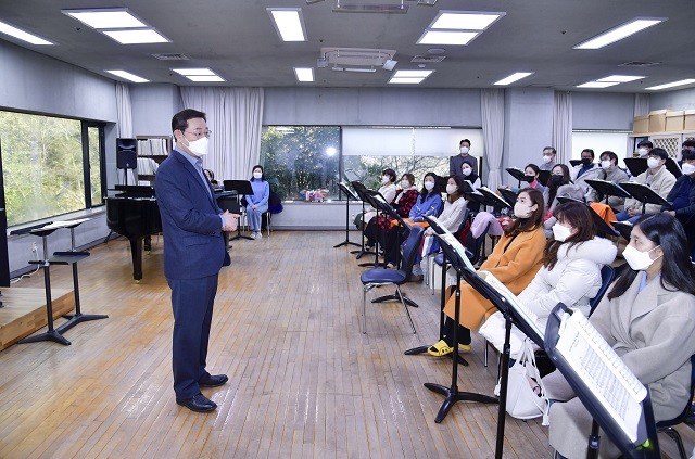 [광주=정찬남 기자] 이용섭 광주광역시장이 18일 오후 북구 문화예술회관 시립합창단을 방문해 단원들을 격려하고 있다./광주광역시 제공