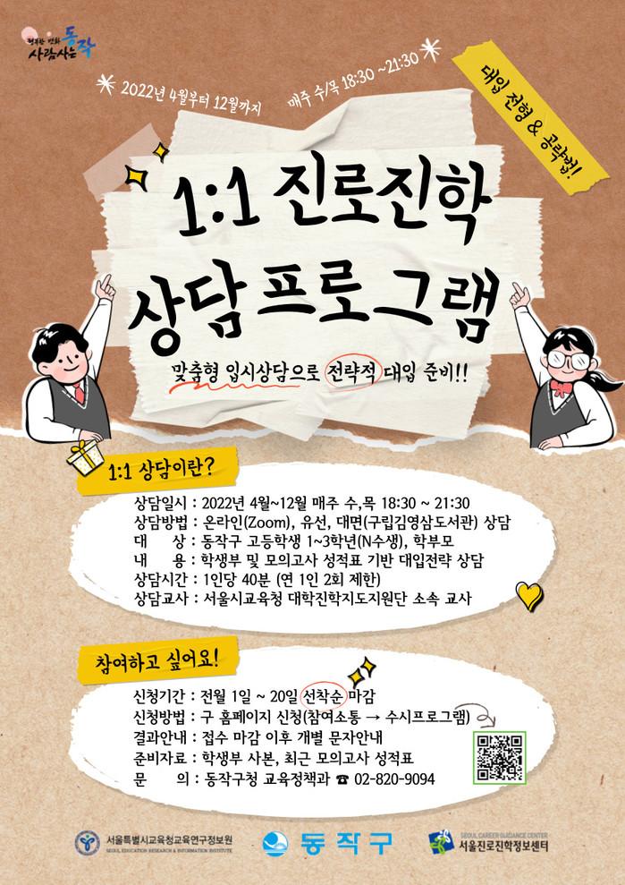 [시민일보 = 여영준 기자] 서울 동작구(구청장 이창우)는 오는 4~12월 다양한 입시정보를 수험생에게 제공하고자 ‘1:1 진로진학 상담 프로그램’을 운영한다고 11일 밝혔다.