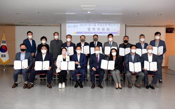 [광주=정찬남 기자] 문영훈 광주광역시 행정부시장이 26일 오전 시청 중회의실에서 열린 지역 직업계고 학생의 선취업-후학습 선순환 생태계 조성을 위한 ‘빛고을 직업교육 혁신지구 협력위원회’ 첫 회의에 참석해 관계자로부터 혁신지구 사업보고와 위원들의 의견을 청취한 후 위원들과 함께 기념촬영을 하고 있다. /광주광역시 제공