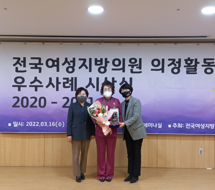 한편, 3월 16일 국회의사당 내 국회의원회관 제3세미나실에서 개최된 이번 시상식은 2010년 1회를 시작으로 올해 5회째를 맞이하고 있는 전국여성지방의원 의정활동 우수사례 시상식은 공모를 통해 여성지방의원들의 우수 의정활동을 발굴하고, 여성 정치참여에 대한 긍정적 여론 형성과 우수 의정활동 사례를 공유·전파하는 역할을 톡톡히 하고 있다.