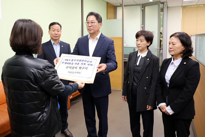 [시민일보 = 여영준 기자] 서울 중구의회 길기영·이정미·송재천·조미정 의원이 3일 감사원에 중구시설관리공단의 인사 전횡 등 여러 의혹들을 규명해달라는 내용의 공익감사 청구서를 제출했다.