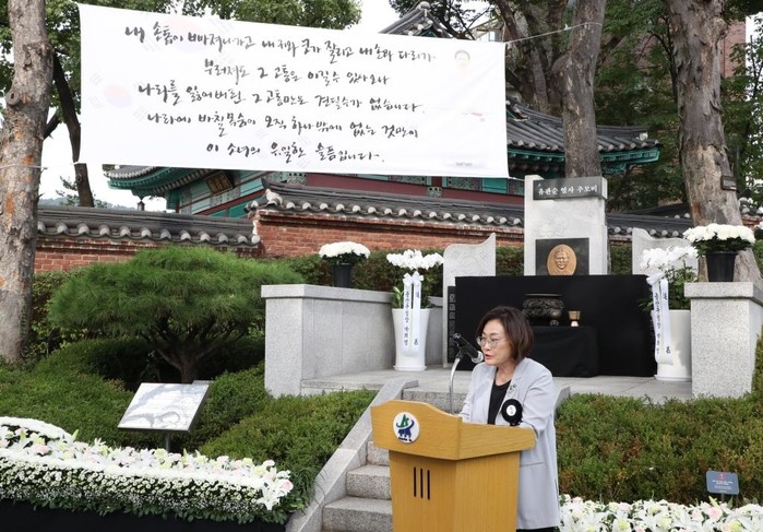 박희영 서울 용산구청장은 지난 28일 ‘유관순 열사 순국 102주기 추모제’ 참석을 위해 이태원부군당 역사공원(녹사평대로40다길 33)을 찾았다. 행사는 국민의례, 내빈소개, 추념사, 헌화 및 분향 순으로 20분간 진행됐다. 사진은 추모제에서 박 구청장이 추념사를 하고 있는 모습.(사진제공=용산구청)