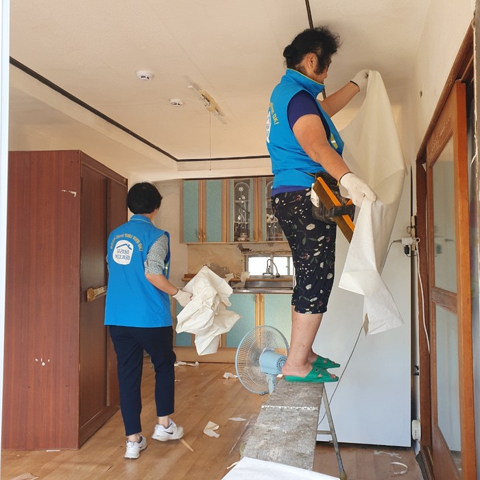 전남 보성군 조성면 우리동네 복지기동대가 최근 주거환경이 취약한 홀몸노인 가정을 찾아가 소규모 주거환경 개선사업을 펼쳤다. 이날 대원들은 무더운 날씨 속에서도 지붕 누수로 집안 내부 도배장판이 곰팡이가 피어 위생상 문제가 있던 대상자의 낡고 오염된 집안의 벽지와 장판을 교체했다. 사진은 대원들이 벽지를 교체하고 있는 모습. (사진제공=보성군청)