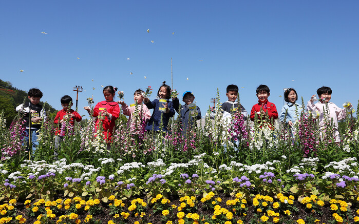 [함평=황승순 기자]제25회 함평나비대축제 개막을 하루 앞둔 27일 오전, 축제가 열리는 엑스포공원 중앙광장에 아이들이 모여 ‘나비날리기 체험’을 하고 있다.