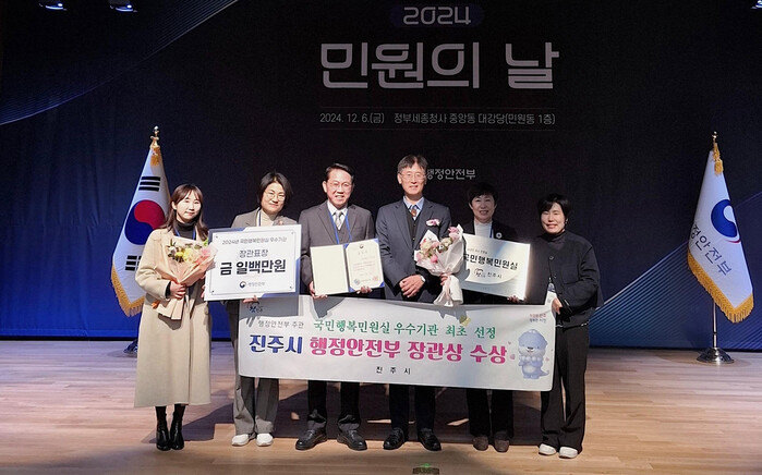 시는 6일 정부세종청사 중앙동 대강당에서 실시한 ‘2024년 민원의 날 민원서비스 우수기관 표창’ 행사에서 행안부 장관 표창을 받았으며, 2027년까지 3년간 ‘국민행복민원실’ 인증을 유지하게 된다. 진주시가 국민행복민원실 인증 평가에서 우수기관으로 선정 된 것은 이번이 처음이다.