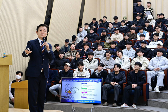 조규일 진주시장은 4일 연암공과대학교 초청 일일특강 강사로 강단에 올라 ‘진주 K-기업가정신’을 대학생들에게 알렸다.