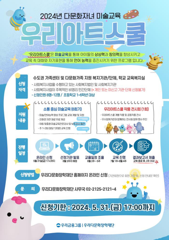 [시민일보 = 여영준 기자] 우리금융그룹 우리다문화장학재단은 다문화 어린이 미술교육 프로그램인 ‘우리아트스쿨’ 참여 기관을 모집한다고 3일 밝혔다.