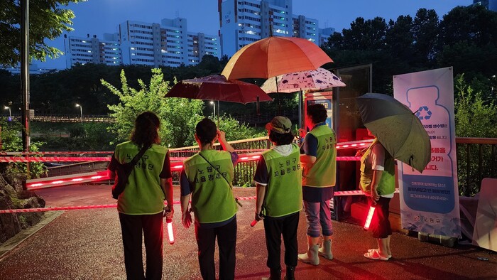 | ▲ 자율방재단 하천순찰단이 집중호우 대비 순찰을 하고 있다. (사진=노원구청 제공) |