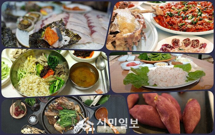| ▲ 해남8미 상단 왼 쪽부터 시계 방향으로 김쌈 삼치회, 해남식 닭요리코스 한상 차림, 여름 갯장어 샤브샤브, 해남산 고구마 디저트, 황칠백숙, 대흥사 보리밥쌈밥 / 자료사진 = 해남군 제공 |
