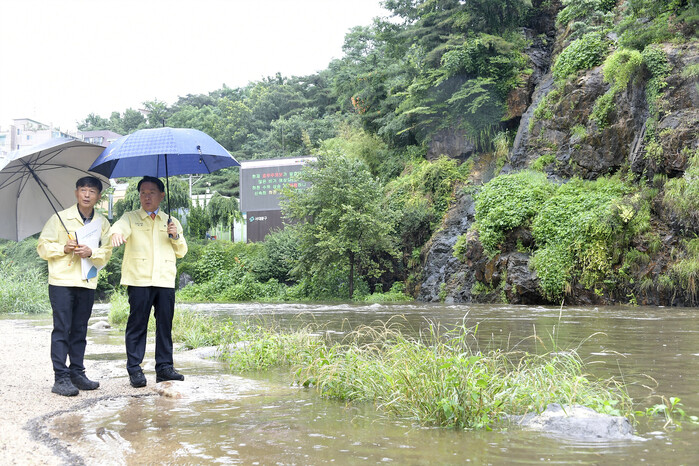 | ▲ 서대문구가 여름철 풍수해에 대비해 안전대책본부를 가동한다. 사진은 지난해 6월 29일 이성헌 서대문구청장(오른쪽)이 호우로 수위가 불어난 홍제천을 찾아 안전상태를 점검하는 모습. (사진=서대문구청 제공) |