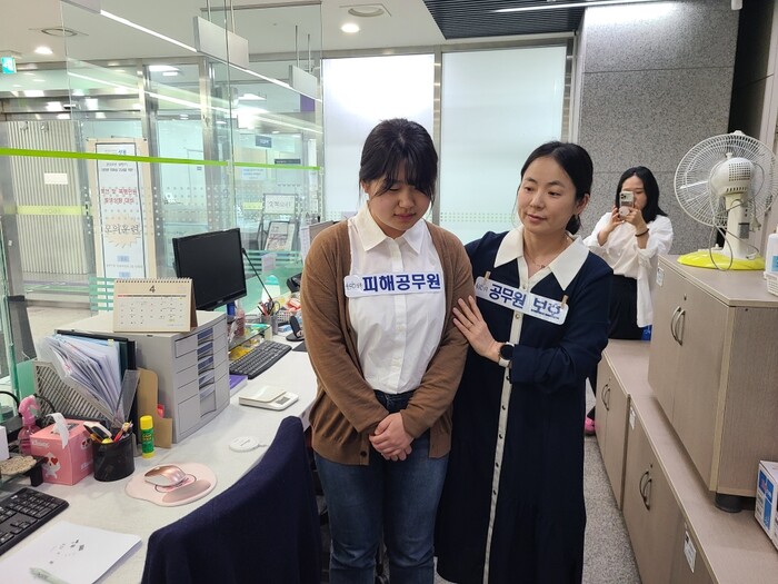 이에 민원 담당 공무원은 위법민원 대응 메뉴얼에 따라 역할별로 민원인의 진정·제지, 위법사실을 고지 후 상담내용 녹음, 인근 지구대로 연결되는 비상벨과 청원경찰 호출, 피해공무원 보호, 가해 민원인 제압과 경찰 인계 순으로 훈련을 진행했다.