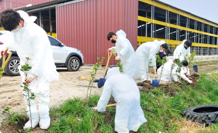 이번“축산환경 개선의 날”캠페인은 영암군 관내 한우농가 등 4개 농장에서 실시하였으며 냄새확산 방지를 위한 완충지대 조성과 자연친화적 농장 경관을 만들기 위해 라일락과 황금측백 300여주를 농장 주변에 식재하였다.