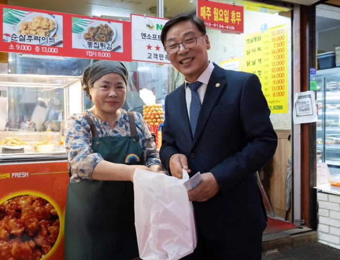 이날 김병전 의장을 비롯해 부천시의회 직원들은 원미금강상점가와 원미부흥시장 점포 곳곳을 돌며 상인들과 인사를 나누고 애로사항을 청취했으며 온누리상품권으로 제수용품과 간식 등 장보기에도 나섰다.