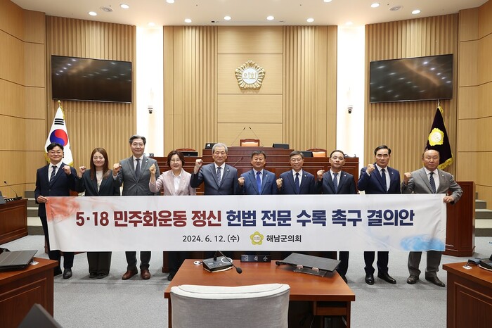 이에 해남군의회는 미래 세대가 우리의 민주주의 정신을 계승해 나가고 국민 모두 화합할 수 있는 계기가 마련될 수 있도록, 윤석열 정부와 제22대 국회가 5·18 민주화 운동 정신의 헌법 전문 수록을 위한 개헌을 즉각 추진하기를 강력히 촉구했다.