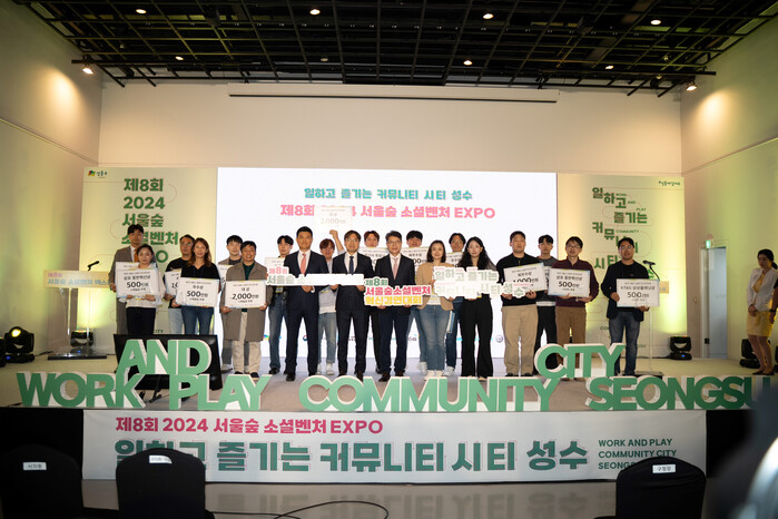 | ▲ 2024년 열린 제8회 서울숲 소셜벤처 엑스포에서 혁신경연대회 수상기업 관계자들이 단체 사진을 찍고 있다. (사진 가운데 정원오 구청장). (사진=성동구청 제공) |