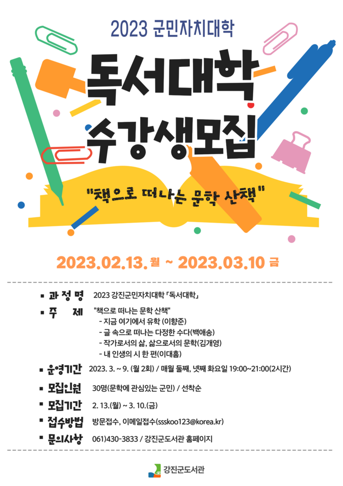 접수기간은 이달 13일부터 다음달 3월 10일까지 4주간이며, 문학에 관심이 있는 군민은 신청서를 작성해 도서관 1층 종합자료실에 제출하거나, 이메일로 접수하면 된다.