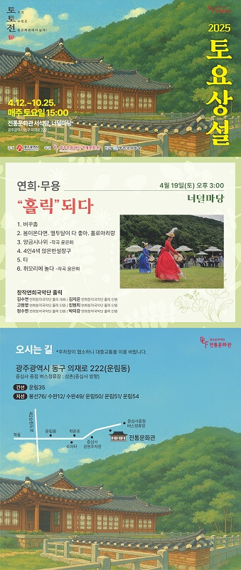 이번 전통문화관 토요 상설공연은 ‘창작연희국악단 홀릭’과 함께 전통의 장단, 아름다운 춤의 선, 리드미컬한 북소리가 어우러진 매력적인 무대로 관객들을 찾아간다.