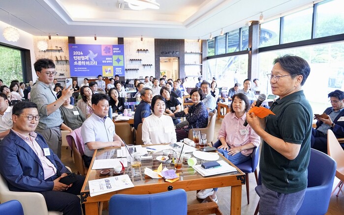 | ▲ 강기정 광주광역시장이 28일 오후 담양군 명지원 정원카페에서 열린 ‘2024 민관협치협의회 통합워크숍’에 참석해 민관 공동프로젝트 추진 방안 등을 논의하고 있다./광주광역시 제공 |