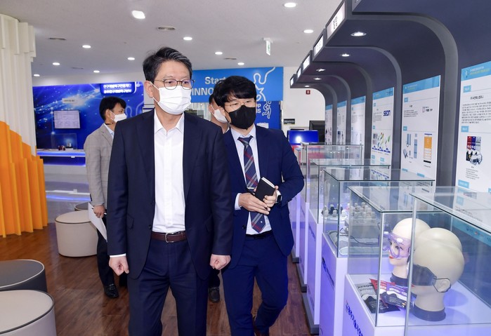 [광주=정찬남 기자] 조인철 광주광역시 문화경제부시장이 21일 오후 북구 첨단3지구 광주이노비즈센터 광주연구개발특구본부를 방문해 애로사항을 청취한 뒤 센터 기술창업 전시관을 둘러보고 있다./광주광역시 제공