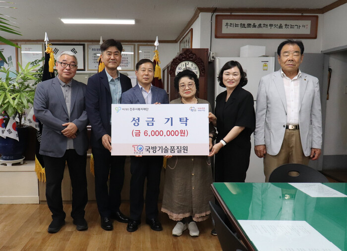 국방기술품질원(원장 신상범)은 호국보훈의 달을 맞아 보훈단체 운영지원에 사용해 달라며 성금 600만 원을 진주시복지재단(이사장 이성갑)에 기탁했다.