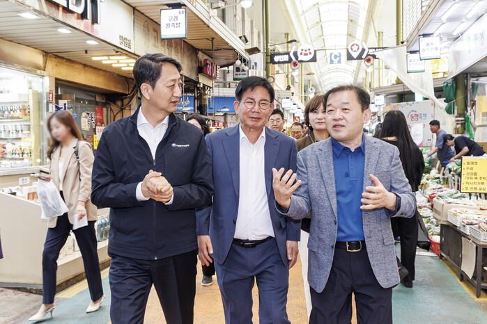 | ▲ 박강수 마포구청장(가운데)이 안덕근 산업통상자원부 장관과 망원시장을 방문했다. (사진=마포구청 제공) |
