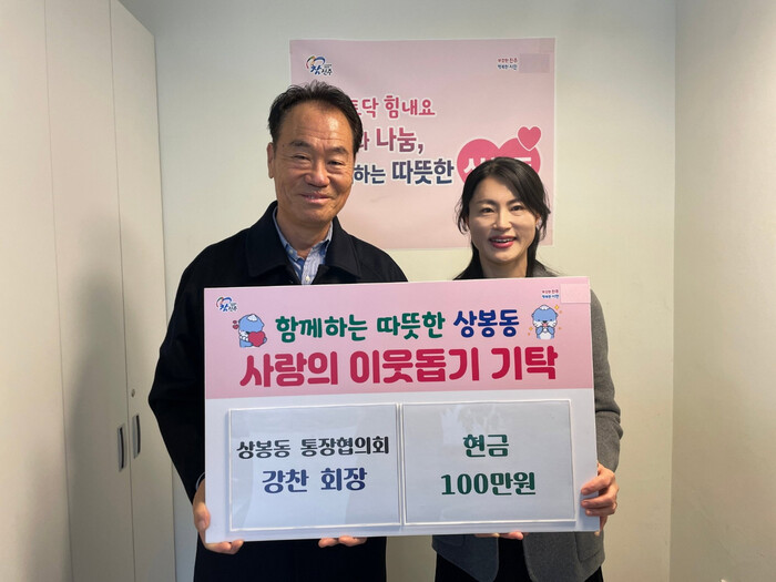 최은영 상봉동장은 “매년 명절마다 이웃을 위한 따뜻한 나눔을 실천해주신 강찬 회장님께 감사드린다”며 “기탁금은 도움이 필요한 이웃들에게 소중히 전달하여 작은 위로와 희망이 되도록 하겠다”고 말했다.