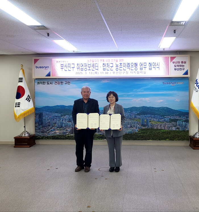 협약식에는 김신조 농촌인력은행 이사장, 김한동 농촌인력은행 이사, 이재숙 농업기술센터 소장, 김석중 농업지도과장, 전영희 부산진구청 문화경제국장, 김원정 부산진구청 일자리산업과장 등 10여 명이 참석해 농업 인력 수급 안정화를 위해 긴밀히 협력하기로 했다.