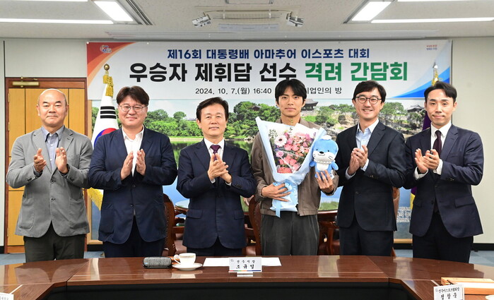 진주시는 7일 시청 기업인의 방에서 제16회 대통령배 아마추어 이스포츠 대회 ‘FC 온라인’ 부문에서 우승한 제휘담 선수를 격려하기 위한 간담회를 열었다.