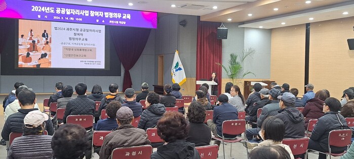 경기 과천시는 지난 14일 공공일자리 참여자 100여명을 대상으로 법정 의무교육을 실시했다. 이번 교육은 안전한 근로 환경 조성을 위해 장애인 인식 개선, 직장 내 성희롱 예방, 안전사고 예방 등을 주제로 진행됐다. 사진은 이날 법정 의무교육을 진행하고 있는 모습. (사진=과천시청 제공)