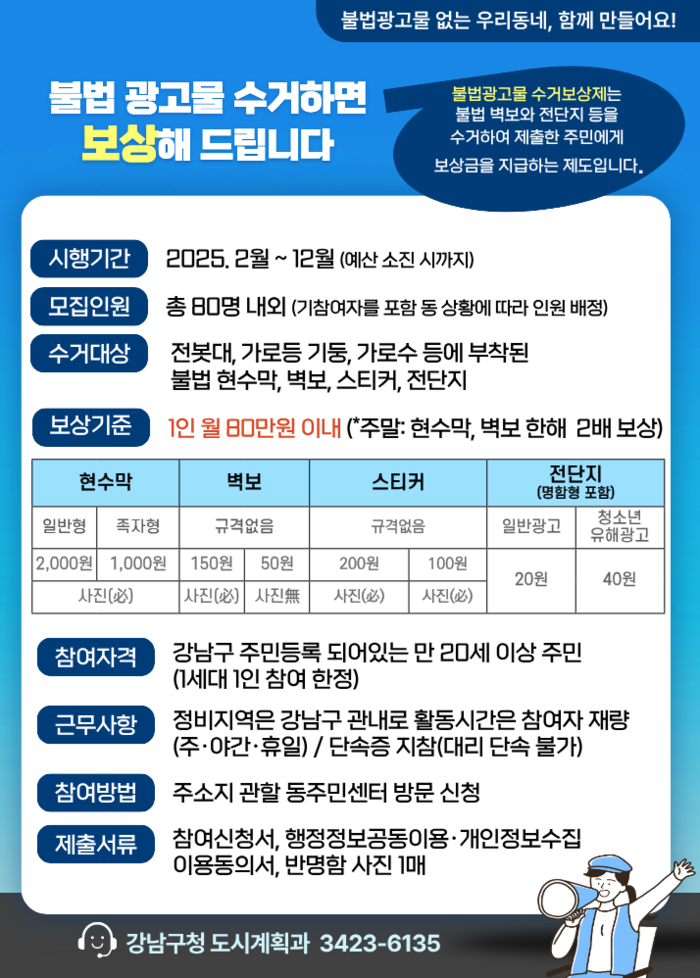 보상금은 월 최대 80만 원 한도에서 현수막 1장당 1,000~2,000원, 벽보 50~150원, 스티커 100~200원, 전단지 20~40원이 지급된다. 주말에는 현수막과 벽보에 한해 평일의 2배 금액이 적용된다. 정비는 강남구 관내에서 이뤄지며, 활동 시간은 개인 일정에 맞춰 탄력적으로 운영된다.