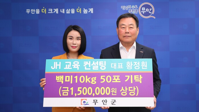 [무안=황승순 기자]전남 무안군(군수 김산)은 26일 ㈜JH교육컨설팅(대표 황정훤)으로부터 어려운 이웃을 위한 쌀 기부 기탁식을 했다고 밝혔다.