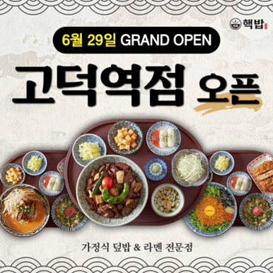 덮밥체인점 핵밥 관계자는 “전국 191호점인 고덕역점을 새롭게 오픈하게 되어 기쁘다. 핵밥 고덕역점은 기존 덮밥메뉴뿐만 아니라 라멘, 소바, 돈까스를 함께 판매하는 전략으로 메뉴 경쟁력을 강화했다. 모든 메뉴는 든든한 한끼 식사, 혼밥에 제격인 만큼 많은 방문 바란다”고 전했다.