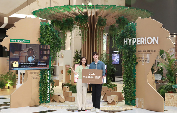 | ▲ 삼성전자 모델이 '2022 에코패키지 챌린지' 개최와 함께 5일부터 12일까지 서울 여의도 IFC몰에서 진행되는 '에코트리' 전시를 소개하고 있다. 올해 3회째를 맞은 에코패키지 챌린지는 TV 포장재를 생활 가구로 업사이클링하는 아이디어를 발굴하는 공모전이다.(사진제공=삼성전자) |