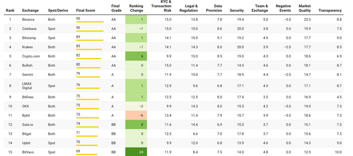 한편 지난 8일 발표된 이번 가상자산 거래소 평가에서 세계 1위는 총점 90점을 획득한 바이낸스가 차지했다. 이어 코인베이스, 비트스탬프, 크라켄, 크립토닷컴 등이 뒤를 이었다.