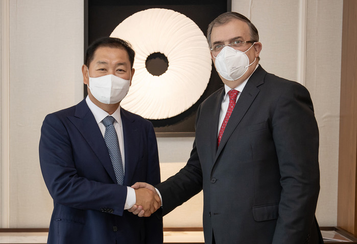 삼성전자 DX부문장 한종희 부회장은 5일 서울에서 마르셀로 에브라르드 멕시코 외교부 장관을 만나 멕시코 현지에서 진행하고 있는 사업과 사회공헌 활동 등을 설명했다.