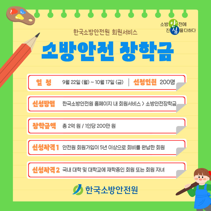 [시민일보 = 여영준 기자] 한국소방안전원은 학업 성취도가 우수하며 사회 안전에 기여할 잠재력을 가진 소방안전장학생을 선발하는 '2025년 소방안전장학금' 행사를 실시한다고 23일 밝혔다.