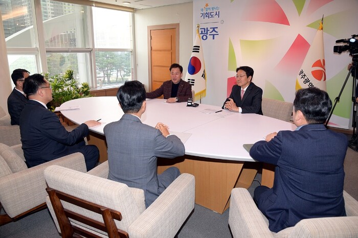 | ▲ 강기정 광주광역시장이 24일 오후 시청 접견실에서 송갑석 국회의원과 광주군공항이전특별법과 관련해 전략을 논의하고 있다./광주광역시 제공 |