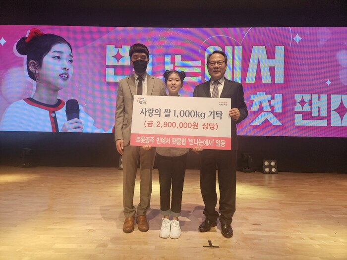 진주출신 트로트 가수 빈예서의 팬클럽 ‘빈나는예서’는 지난 23일 지역 내 어려운 이웃을 위해 써 달라며 팬클럽 회원들이 모은 성금으로 마련한 백미 1000kg(환가액 290만 원 상당)을 진주시복지재단(이사장 이성갑)에 기탁했다.