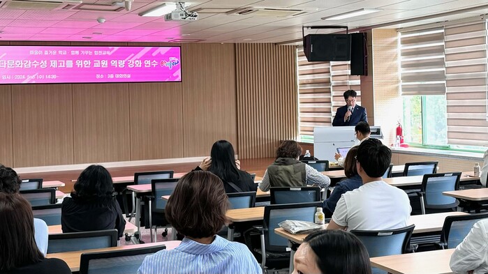 이번 연수는 진주 갈전초 변진희 교장선생님을 초빙해 학교문화의 다양성과 다문화이해교육을 주제로 진행되었다. 연수를 통해 다문화주의, 문화다양성과 다문화사회에 대한 이해를 바탕으로 학교와 일상생활 속에서 다문화학생이나 다문화가정에 대한 다름을 인정하고 다양성을 존중해야 함을 강조했다.