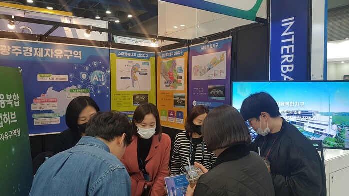 광주경자청은 현장에서 홍보관을 운영하며 ‘광주경제자유구역 혁신생태계 소개’,‘스마트에너지 산업지구Ⅰ·Ⅱ(에너지밸리 일반산단, 도시첨단산단) 분양 안내’,‘광주 배터리산업 인프라와 투자여건 홍보’,‘인공지능과 연계한 에너지전환 및 신산업 육성방안’ 설명과 함께 투자상담을 진행하고 있다.