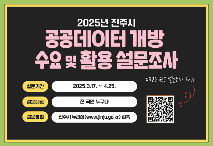 진주시는 시민 목소리를 반영한 맞춤형 공공데이터 개방을 통해 공공데이터의 활용도를 높이기 위한 ‘공공데이터 개방 수요 및 활용 설문조사’를 오는 4월 25일까지 실시한다고 밝혔다.