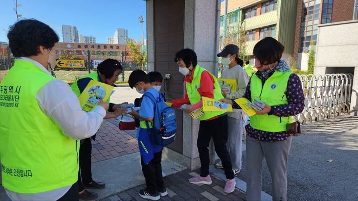 [광주=정찬남 기자] 광주광역시는 5일 재난 안전사고부터 안전한 광주를 만들기 위한 자율안전점검 문화 확산을 위해 ‘2022년 대한민국 안전대전환’의 일환으로 광산구 송정서초등학교 일원에서 시민봉사단과 함께 자율안전점검표 배부하고 자율안전점검에 적극 동참해줄 것을 당부했다./광주광역시 제공