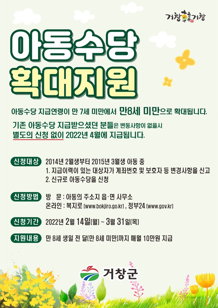 구인모 거창군수는 “아동수당 연령 확대가 더 많은 아동의 건강한 성장에 도움이 되길 바라며, 대상자가 누락되지 않도록 안내문 발송 등을 통해 적극 홍보하겠다”고 말했다.