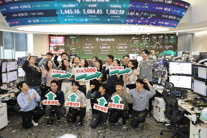27일 오후 서울시 중구 하나은행 딜링룸에서 딜러들이 코스피 5000 시대 개막을 축하하고 있다.(사진=하나은행 제공)