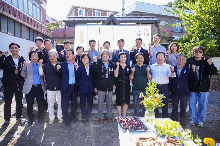 | ▲ 강기정 광주광역시장(앞줄 오른 쪽부터 네 번째)이 4일 오후 남구 양림동 10년후 그라운드 가든에서 열린 '2024 양림골목비엔날레 개막잔치'에 참석해 김병내 남구청장 등 내빈들과 기념촬영을 하고 있다./광주광역시 제공 |
